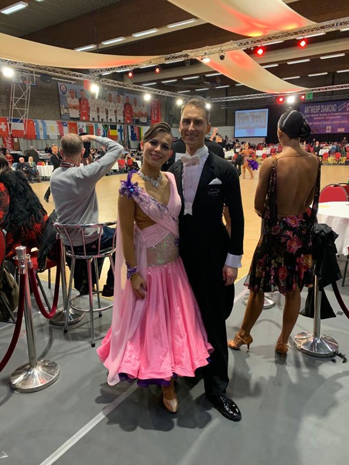 Dieses aufregende Abenteuer durften Christian und ich erleben. In unserem ersten Seniorenjahr wurden gleich zwei Weltmeisterschaften im Februar ausgetragen. Unser erster internationalen Auftritt bei den Senioren I war gleich die WM Standard in Antwerpen am 07.02.2020. Am Vortag reisten wir an und unternahmen zu Fuß unsere Erkundungstour. Dabei waren wir als Fußgänger außerhalb der Innenstadt eine große Ausnahme. Die Belgier waren fast ausschließlich mit dem Rad oder dem Auto unterwegs. Teilweise gab es keine Fußwege. Am nächsten Tag tanzten wir hoch motiviert und zugleich gespannt, wo man uns einsortieren würde, unsere erste Weltmeisterschaft. 106 Paare aus 22 Nationen waren am Start. Davon vertraten 28 Paare den DTV. Mit sehr hohen Kreuzzahlen erreichten wir die 80er und später die 48er Runde. Damit war unser Minimalziel erreicht. Voller Freude konnten wir auch in dieser Runde die Wertungsrichter von uns überzeugen und zogen ins Viertelfinale der besten 28 Paare ein. Gegen 21 Uhr wussten wir das Ergebnis: Wir erreichten bei unserer ersten WM den 28. Platz. Ausruhen war noch nicht möglich. Am kommenden Tag stand schon unsere Gemeinsame Landesmeisterschaft Senioren I S Latein in Buchholz an. Also, fuhren wir noch in das kleine Örtchen Notterveld (Niederlande) und suchten dort unsere Unterkunft. Gefühlt führten uns die Wegweiser unserer Pension in einem großen Bogen durch die Ortschaft ehe wir unser Ziel erreichten. Trotz telefonischem Hinweis unsererseits, wann wir voraussichtlich ankommen werden, war die Pensionsleiterin schon eingeschlafen und kaum zu wecken. Nach über 15 Minuten fand sie den Weg zur Haustür, um uns hinein zu lassen. Entschädigt wurden wir mit einem schicken Zimmer und einem liebevoll hergerichteten Frühstück. Weiter ging es nach Buchholz. In einem kleinen aber feinen Feld von drei Paaren konnten wir souverän mit 22 von 25 möglichen Einsen alle Tänzen gewinnen und somit den Landes- und Norddeutschenmeistertitel entgegen nehmen.