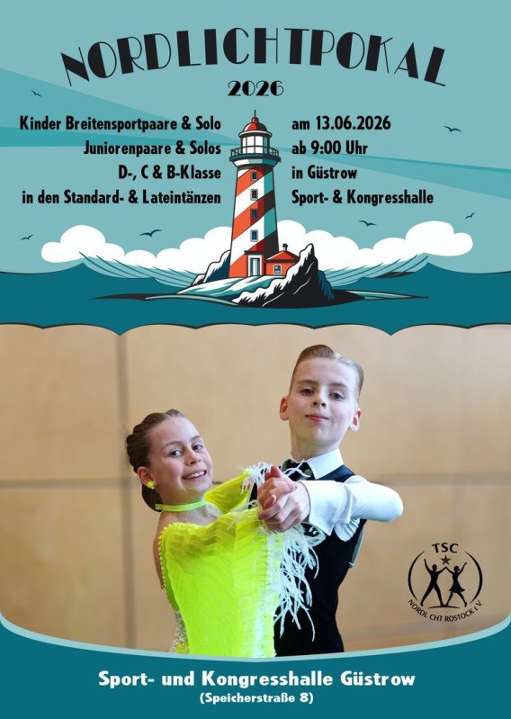 Am 13.6.'26 richten wir den 2. Nordlichtpokal aus. Bei diesem treten die Kinder Breitensport- und Juniorenpaare, sowie je Solo, in den Standard- & Lateintänzen der Klassen B, D und C gegeneinander an.